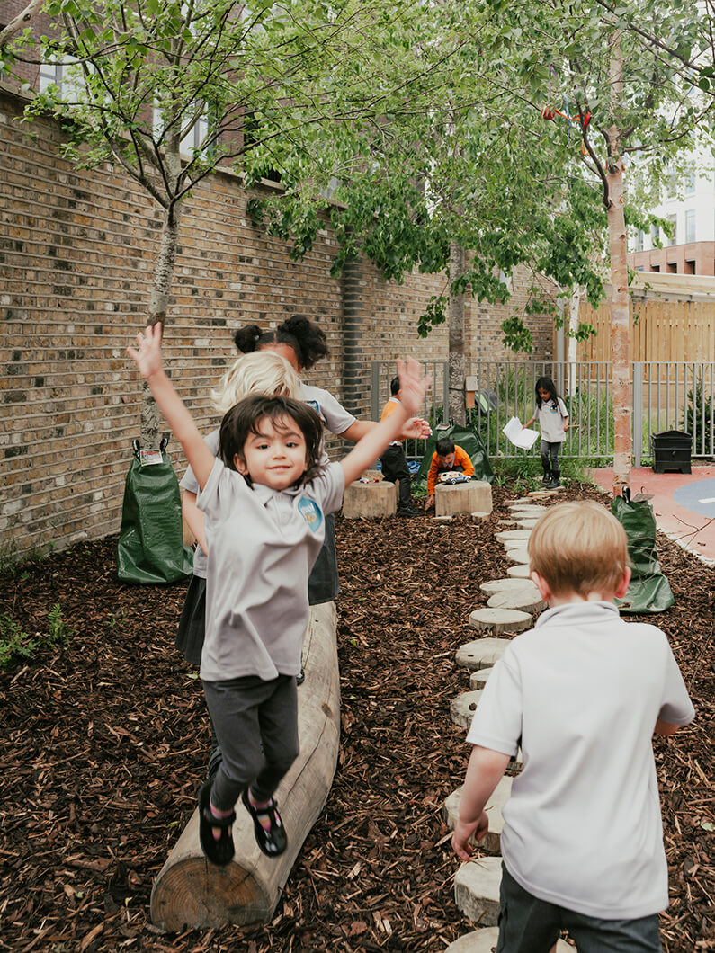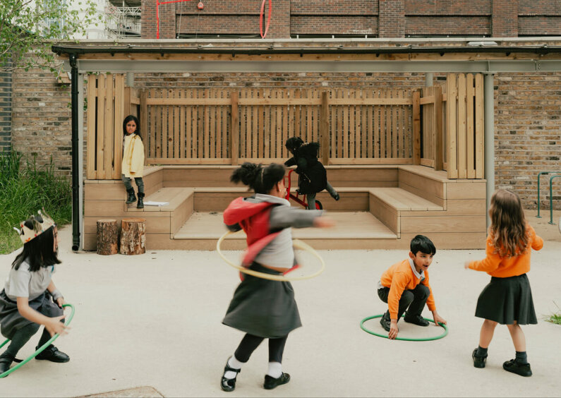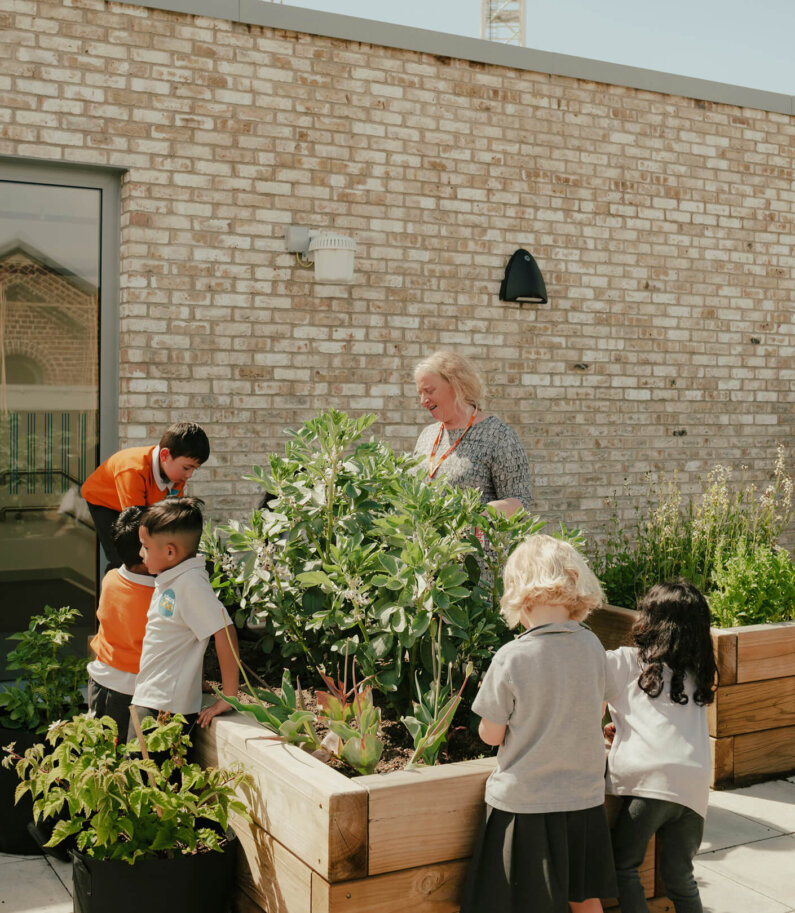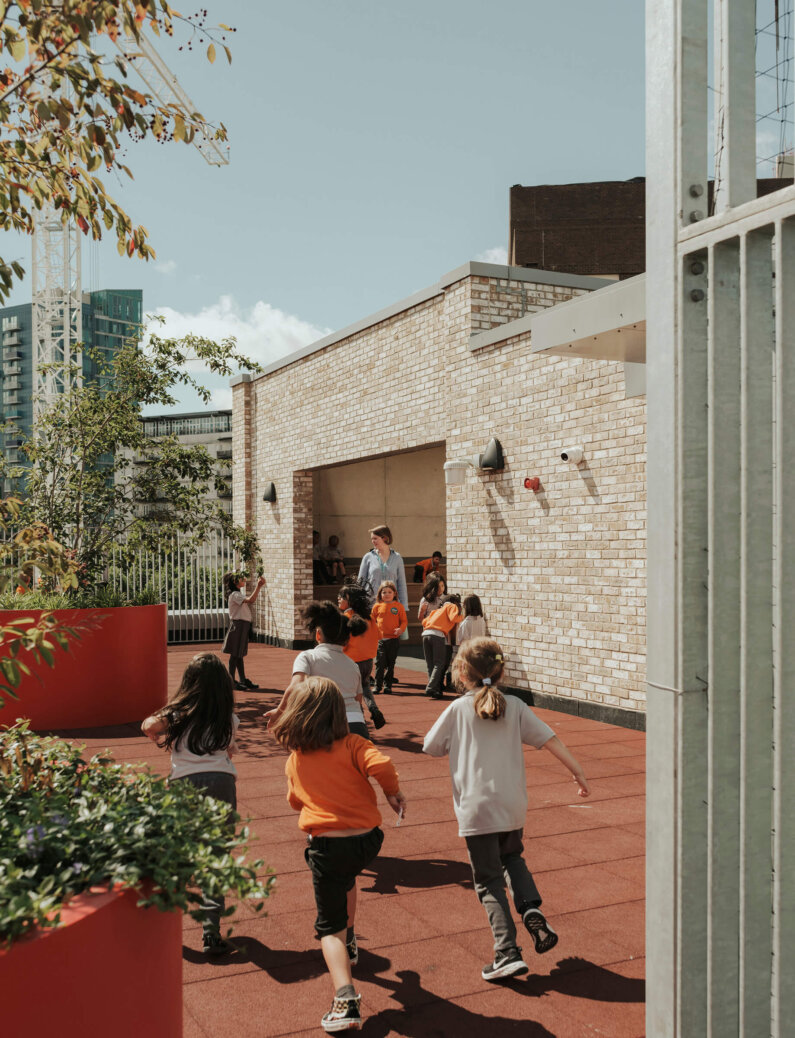 The outdoor play is located in two main areas. The rooftop includes a playground, community garden, and a multi-use games area (MUGA), whilst the ground floor playground provides more green spaces, including a ‘Forest School’ and an outdoor classroom for reading and group activities. Reception, Year 1 and Year 2 classrooms have direct access to the outside, with designated play areas for Reception and Year 1. The design has maximised the number of classrooms that have direct access to outdoor space by lifting the main hall and kitchen to the first floor.